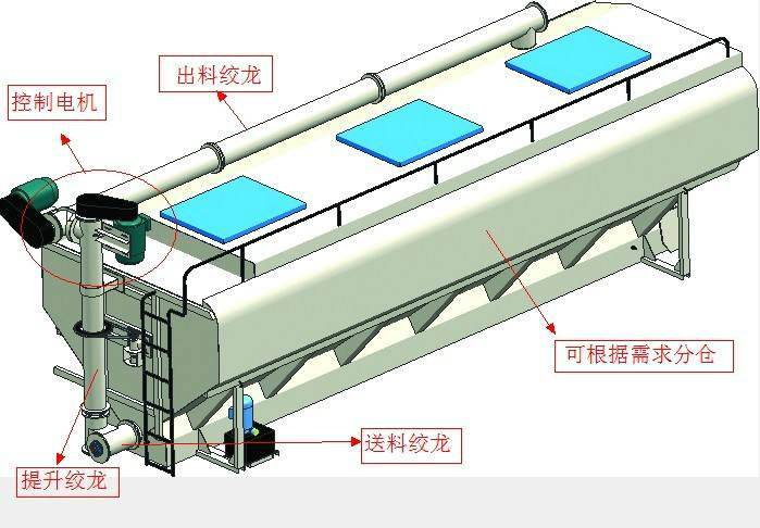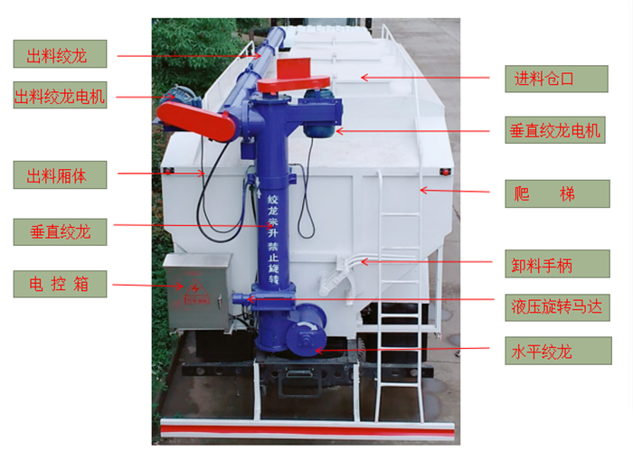 上裝罐體:罐體材質(zhì)采用4mm優(yōu)質(zhì)碳鋼板,整車(chē)3條絞龍,由3個(gè)5.5KW電機(jī)380V外接電源帶動(dòng)頂部絞龍用液壓控制舉升,可左右旋轉(zhuǎn)180°。罐體內(nèi)分為貳個(gè)倉(cāng),可以獨(dú)立控制各分倉(cāng)卸料順序和速度。