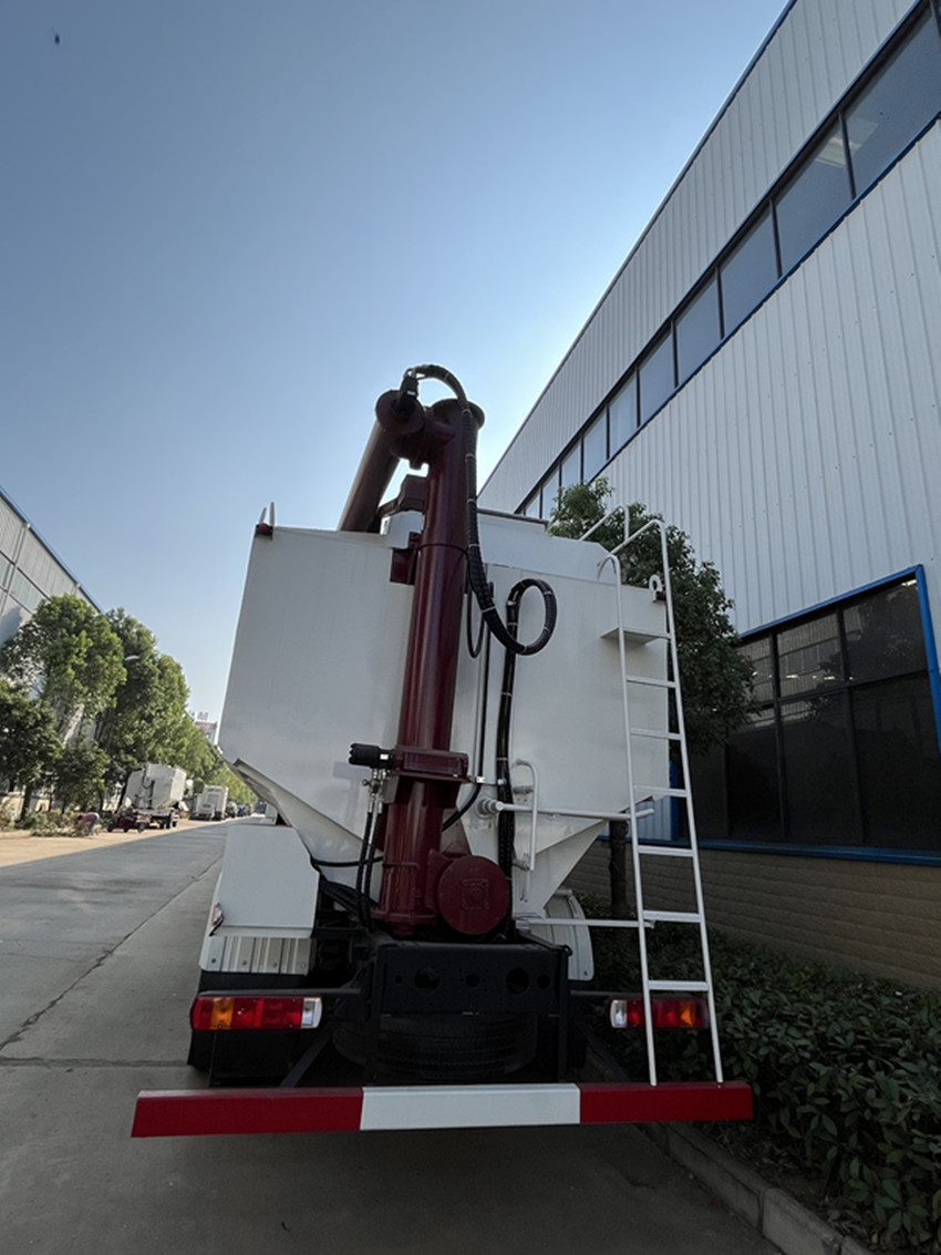 散裝飼料運(yùn)輸車,散裝飼料車的飼料罐架設(shè)在卡車的底盤上,罐頂開有進(jìn)料口.頂部的一根螺旋輸送卸料管(俗稱卸料絞龍)則可自由回轉(zhuǎn)和抬升,抬升的仰角可達(dá)60度。運(yùn)輸時(shí),頂部的螺旋管平臥在罐頂;卸料時(shí)則抬起,使管端的出料口與畜禽飼養(yǎng)場(chǎng)貯料罐頂部的進(jìn)料門相接,駕駛室內(nèi)裝有操縱裝置(操縱裝置也可裝置在罐體尾部),卸料時(shí)通過(guò)車底的動(dòng)力輸出軸和減速器來(lái)驅(qū)動(dòng)螺旋,以完成卸料。